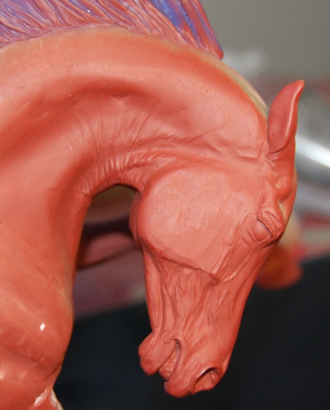 No changes were made between these two pictures except the addition of primer (although the angle is a bit different). Apoxie® Sculpt, particularly in what they call the "Natural" color, is somewhat translucent--which makes it quite difficult to see details. I needed to give him a coat of primer on this side of his head so that it would photograph better--I now need to match the other side of his head to this one, and it's easier with a flipped photograph, and a mirror as well! You can see that his head is still pretty rough, with visible tool marks and other defects. This guy still has a long way to go--only one of his legs has any detail sculpted in at all right now! His ears are solid because I know I will break them while sculpting if I carve them out now (also why he doesn't have a forelock); his chest is quite rough... just a lot to do! I only work on him evenings and weekends, so it does take longer as well (workdays are spent painting).